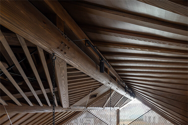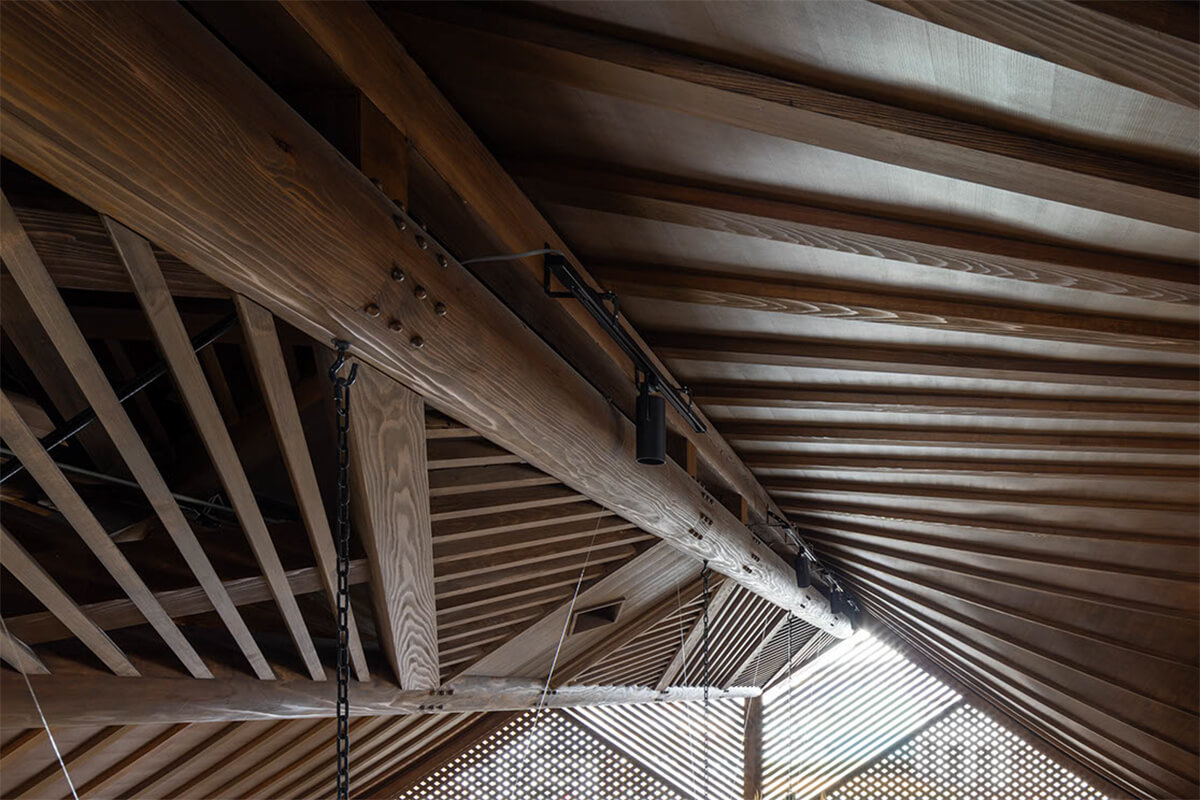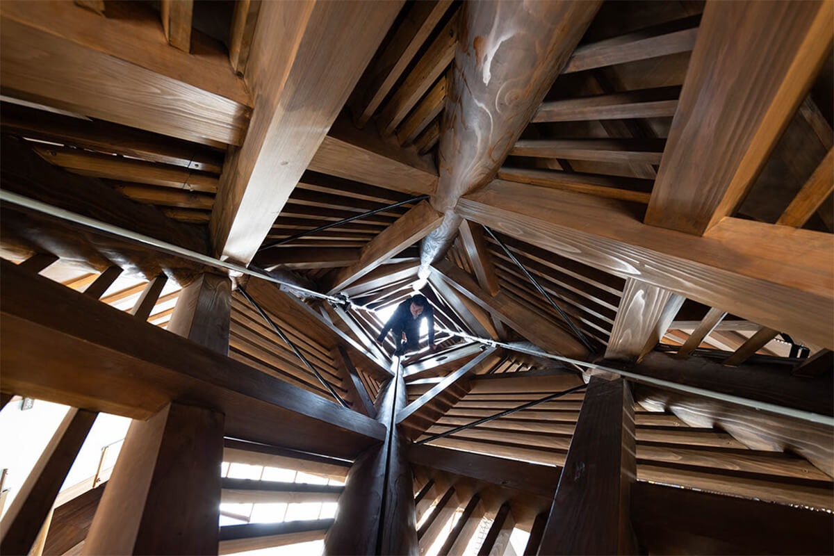 この案を気に入っていただいたことで、6間半×4間半の無柱空間とするための長さ12mの杉丸太4本組の龍骨(キールトラス)で屋根を支える前例のない木造建築の計画がスタートした。