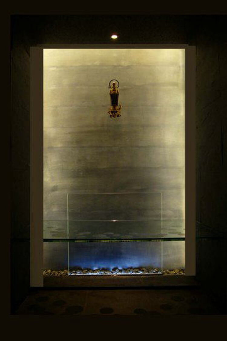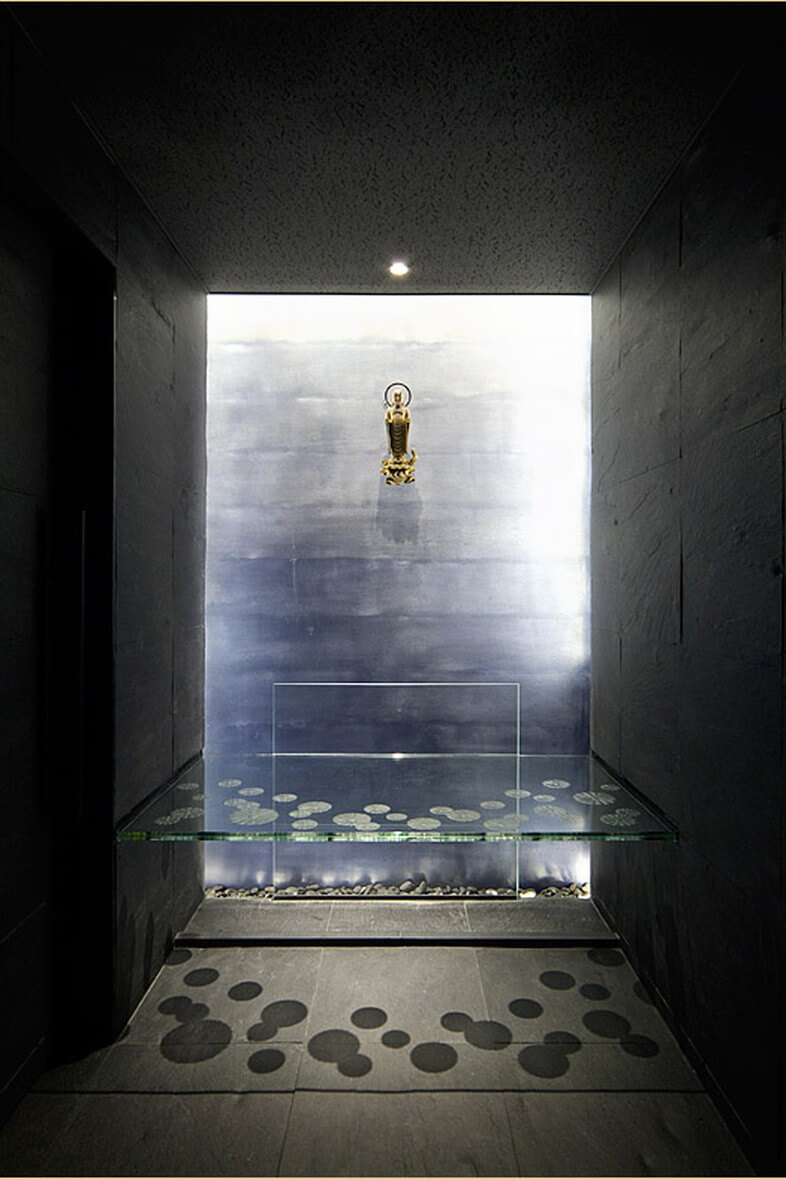 お別れ室の仏後壁は奥深い安らぎを醸すように、グラデーションをつけた大津磨きの土壁とした。土壁は淡路島のら久住有生左官の手による。青色グラデーションの大津磨き壁だが、LEDの照明により金色に輝く。おわかれ室の置き台は強化合わせガラスで、菊文様を彫りこんでいる。床・壁は玄昌石貼り。建具にも玄昌石を貼っている。安置室は御影石の馬蹄形の置き台に青色LEDの光をライン状に当てている。