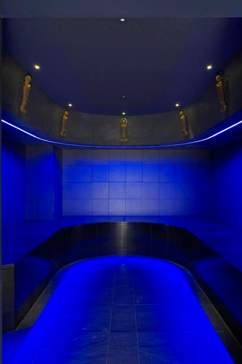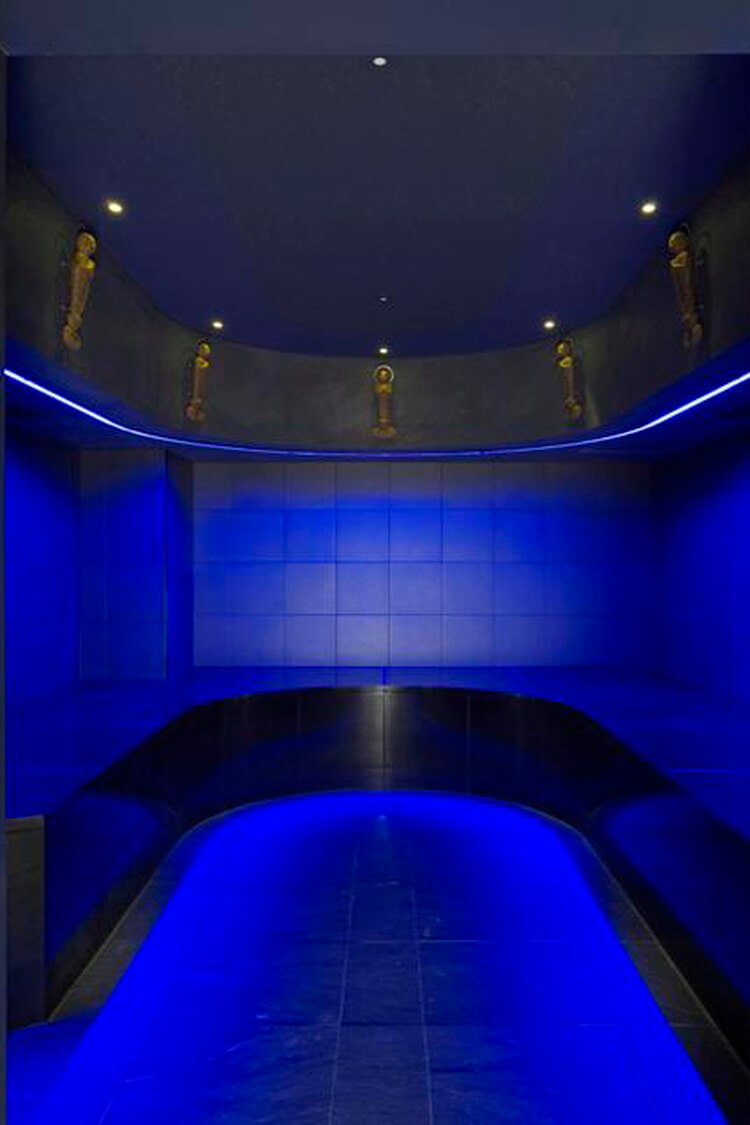 青色グラデーションの大津磨き壁だが、LEDの照明により金色に輝く。おわかれ室の置き台は強化合わせガラスで、菊文様を彫りこんでいる。床・壁は玄昌石貼り。建具にも玄昌石を貼っている。
